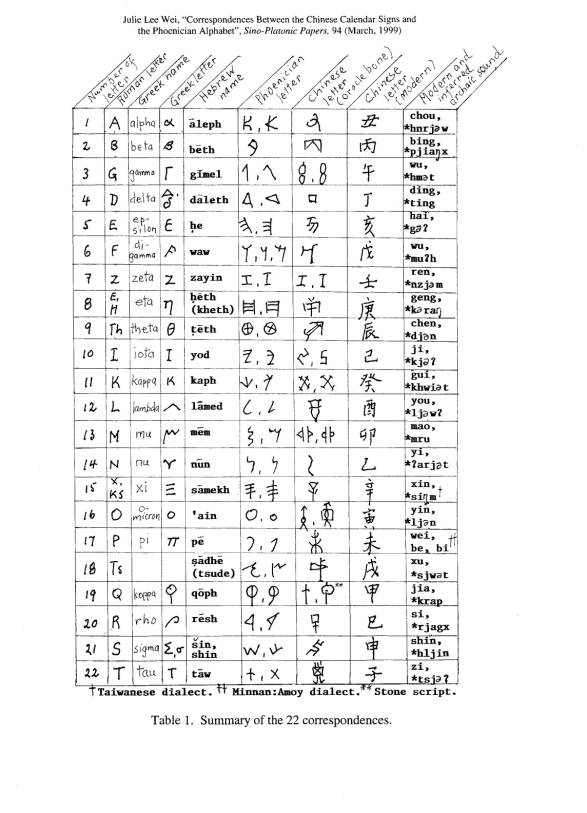 在蒲立本之外,諸如H.Morgan, D.Kelley及V.Mair等學者都企圖將22干支與腓尼基22字母加以比擬,希望建立兩者間的關係。Mair在1996年的文章中表示,這兩組符號系統中,在聲音和字形上絕對一致的至少有15組。李珠莉(Julie Lee Wei) [20]對此一問題相當有興趣,受Mair的研究影響繼續研究,針對羅馬字母、希臘字母、希伯萊名稱及意義、腓尼基字母、甲骨文字、現代漢語、現代漢語發音和古代擬音、蘇美文、古埃及文、亞述文、塞爾特文、日爾曼文、以及其他文字的比較研究,將22組符號對照羅列,完成了一個對仗完整的圖表,見【圖一】及【圖二】。這個結果當然相當大膽,但也相當驚人。