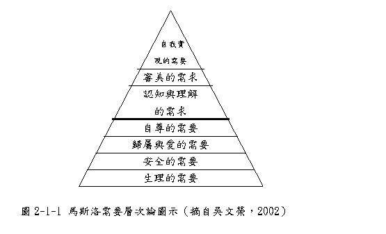 馬斯洛提出的需求動機理論,指出人性需求層次由下而上分別為:(一)生理需求、(二)安全需求、(三)歸屬與愛的需求、(四)自尊需求、(五)自我實現的需求。其後他感到這一層次架構不夠完整,因此,於1969年又發表了一篇重要文章《Theory z》,即「Z 理論」,來重新思考多年來所發展出的需求理論,並歸納成為三個次理論。認為人有七種基本的需要,其滿足先後依次排列成一個階層,如圖2-1-1