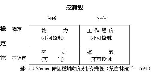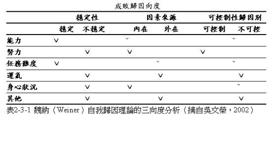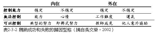& unstable)以及內在與外在的(internal &external)兩大類;前者是與學生失敗的一致性(consistency)有關,後者則是與學生認為失敗的原因是產生於內在或外在有關。且其結果的歸因可分為三個向度:「因素來源」、