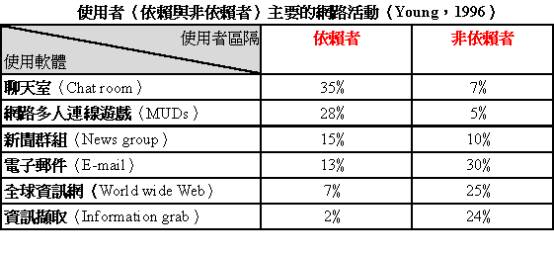 從上表可以看出網路依賴者所從事的線上活動類型中,比例最高的前兩名『聊天室』、『網路多人連線遊戲』均屬即時互動的運作形式,這也說明網路提供了另一種人際交往的平台,使人們多了另一種有別現實人際溝通的管道。