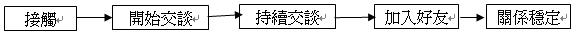 聽完小真在網路聊天室的故事,筆者將其網路人際關係的開展與維繫依時間的脈絡分為接觸、開始交談、持續交談、加入好友、關係穩定五個階段來探討: