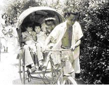 迎娶過程:汽車的發明,使得有錢的人家,以人力車(如圖四)或是汽車(如圖五)去迎娶新娘,而汽車也象徵著身份、地位與財富。新娘的裝扮由紅色的鳳冠霞披轉變成頭戴白紗,身穿及膝洋裝或裙襬及地的白禮服,手持捧花;而新郎也改穿西式的黑色禮服(如圖三)。