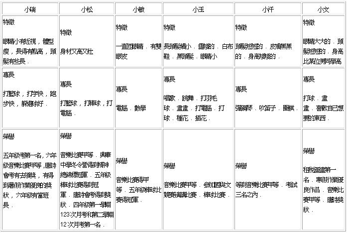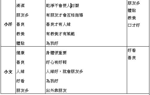 小玉,他本身是一個比較注重個人性感覺的人,不是說比較在意他人眼光,是指說他要給人一種乾淨,清潔,清爽的感覺,所以他所要得到的特質比較不會是成績方面的,較集中在外表類與品行類。