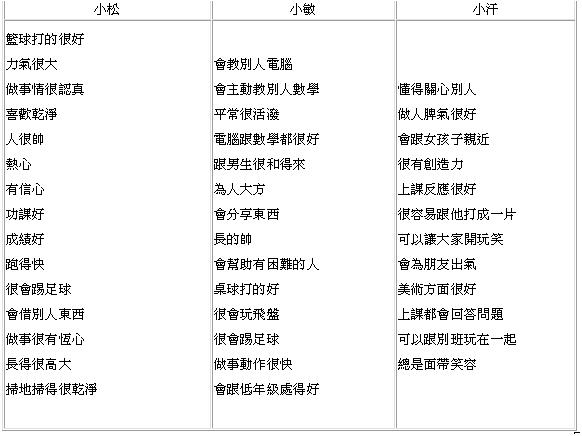在優點大轟炸之前,我先要班上的小朋友給自己一些回饋,要他們寫出自己對自己的觀察,寫出自己較好的優點,比如特徵方面,把自己的專長整理歸納,並且條列出自己以往所得過的榮譽,來令自己自我增強,感覺自己也很不錯,起到歸納、回顧、整理,並以舊經驗來令自己更加充滿信心。