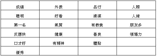 在價值大拍賣中,我列出了下面十六種特質要小朋友依自己的重視程度來選擇,而且價高者得,該項特質如果已經被買去的話,其他人就會失去機會,記列出了四大類特質。
