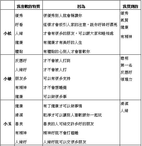 在拍賣之前,我先要小朋友寫出他們所想購買的特質,以便用之於做事後所買得特質之比較,並且用來作為分析,因為事實上他們所買得的特質,基本上已經有所偏離他們原先所要的,因為拍賣要顧慮要在大家面前表露自己的喜好,要跟大家競爭,要把握時機..等等,所以他們想要的比較接近於他們內心的事實。