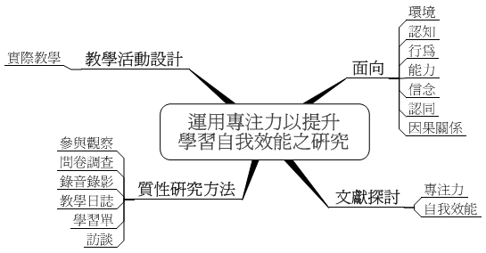 培養優質的專注力可以消除挫折與壓力,增進個人的信心,提升創造力,達到事半功倍的效果。在教學場域方面,培養學生專注力可以改善班級常規,減少教師班級經營負擔,增進教師教學品質,提升學生學習自我效能。本研究以質性研究的方式探究國小學童運用專注力以提升學習自我效能之情形,從六大向度分析專注力持久性、達成有效教學的程度及專注力在教學前後之因果關係,並編製教學活動設計於教學現場作實際的教學活動,以多種資料蒐集的方法(三角校正)分析及驗證研究之效度,而能符應本研究之目的。