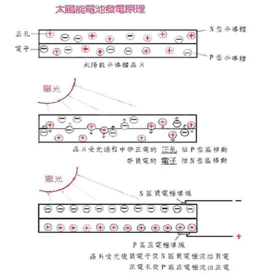 太陽能電池係一種利用太陽光直接發電的光電半導體薄片,其將高純度的半導體材料加入一些不純物使其呈現不同的性質,如加入硼可形成 P 型半導體,加入磷可形成 N 型半導體,PN 兩型半導體相結合後,當太陽光入射時,產生電子與電洞,有電流通過時,則產生電力,發電原理可參考下圖。