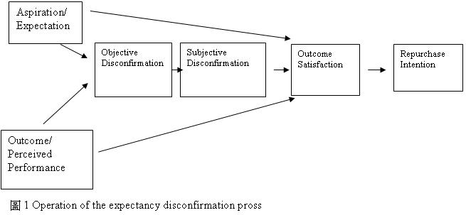 期望不確定理論(expectancy disconfirmation),原來是由組織行為學、社會心理學、消費者心理學所發展出來的。Oliver(1980)提出期望不確定模型,被認為是消費者滿意度研究的模型基礎架構。消費在購買某項物品之前,先對於該項問品在消費者心目中給予相當程度的預期水準,此時,將會有三種結果。其一,原先使用者覺得該項產品應達某程度之使用滿意,但卻不足以達到讓使用者滿意的程度。則產生反向的不確定(negative disconfirmation)。其二,若消費者使用滿意程度比預期程度來的高,則表示,該項產品讓消費者使用的滿意度高於消費者原先的預期,此為正向不確定(positive disconfirmation)。其三,若消費者使用後的滿意知覺與原先期望是相等的,此為確定(confirmation),對於使用的滿意度不會有影響。(圖1)