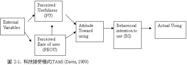 科技接受模式主要有其三個論點,分別是個人認知的有用性(Perceivedusefulness,PU)、認知的易用性(perceived ease of use, PEOU)、以及社群壓力(Socialpressure)(Davis, 1989; Adam, 1992; Mathieson, 1991)。(圖2-1)