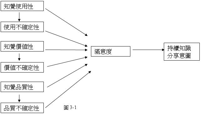 綜合以上觀點後,可以將影響知識分享意圖的因素予以歸納整理。首先,對於系統的使用性、價值性、品質性對於整個行為的滿意度可能會有所影響。而針對使用性、價值性、品質性三項因素,以期望不確定原理來討論學習者對整個行為的滿意度。而滿意度會影響意圖。在之前研究中已說明滿意度會影響使用者意圖。故此,我們可以將這三者的影響關係,繪成下圖(圖3-1),用來討論各項因素的相互關係。