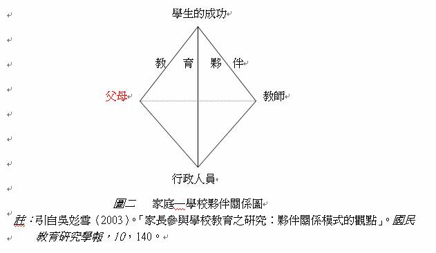 吳彣雪(2003)。家長參與學校教育之研究:夥伴關係模式的觀點。國民教育研究學報,10,123-154。