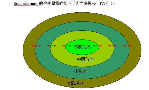 Bronfenbrenner的生態學模式如下(引自張麗芬,1997):