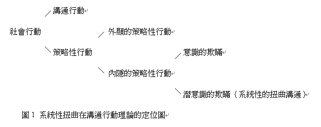 然而,Habermas的這些理性溝通的預設想法,他認為那是一種現存的生活方式,但也是點明了理想生活的模式(江志正,1998)。不過實際上溝通結構常受到系統的限制(srstematic constraint),而致使參與言談的人無法自由決定溝通的方式,因此導致了「系統性的扭曲溝通」(systematically distorted communication)情況(Habermas, 1981/1984),而這也是因為權力因素或意識型態干涉溝通的現象。Habermas進一步將系統性的扭曲溝通定位於其溝通行動理論的架構中,詳細結構圖如下(Habermas, 1981/1984):