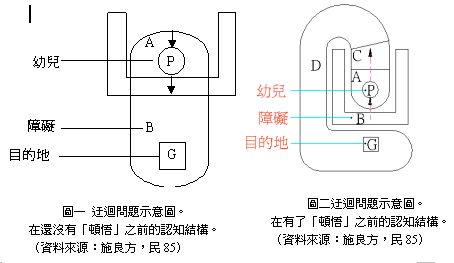 »{¬°¾Ç²ß¬O»{ª¾µ²ºcªºÅܤơA©Ò¿×»{ª¾µ²ºc¡]Cognitive Structure¡^¬O«üÓ¤H¹ï¤H¡B¹ï¨Æ¡B¹ïª«©Î¹ïªÀ·|²{¶Hªº¬Ýªk¡A¨ä¤¤¥]¬A«ÈÆ[ªº¨Æ¹ê¡B¥DÆ[ªºª¾Ä±¡A¥H¤Î¨âªÌ²Õ¦X¦Ó¦¨ªº·§©À¡B²z¸Ñ¡BÆ[ÂI»P§PÂ_¡]±i¬K¿³¡A¥Á78¡^¡C¨ä¹ê¹ïµ¦²¤¡B¤èªk¡Bì²zì«hªº»{ÃÑ»PÅéÅç¥ç³£¬O»{ª¾µ²ºcªº¤º²[¡C°Ç·Å¡]Lewin¡A1942¡^´¿¥H¨±°j°ÝÃD¡]¦p¹Ï¤@¡^¸ÑÄÀ»{ª¾µ²ºcªºÅܤơA¥®¨à¡]P¡^»P¥Ø¼Ð¡]G¡^¡]¦pª±¨ã¡^¤¤¶¡¦³U«¬»Ùꪫ¡]B¡^¡A·í¥®¨à¦V¥Ø¼Ð«e¶i¡A»Ùꪫ¡]U¡^ªº¬ù§ô¤O¤Ó¤j¨Ï±o¥®¨à¤£¯à§JªA¡A¥i¬O«á°h«o¤Sµ¥©ó»·Â÷ª±¨ã¥Ø¼Ð¡C¤@ª½µ¥¨ì¥®¨à¦³¡u«á°h¡B¶¹L»Ùꪫ¡]U¡^¦ÓÁÍ«e¥i©è¹Fª±¨ã¥Ø¼Ðª«¡]G¡^¡v¡]¦p¹Ï¤G¡^ªº¹y®©®É¡A°ÝÃD¸Ñ¨Mªº¥ô°È¤~§i§¹¦¨¡C°ÝÃD¡]Problem¡^¦³¤TÓ¥Dn¦¨¥÷¡G¤@Ó°²³]©Î²{¦³ª¬ºA¡A¤@ӥؼЪ¬ºA¡A¥H¤Î¥Î¥HÂಾ°²³]©Î²{¦³ª¬ºA¤§¥Ø¼Ðª¬ºAªº¤@²Õ¾Þ§@¤¸¡]A
