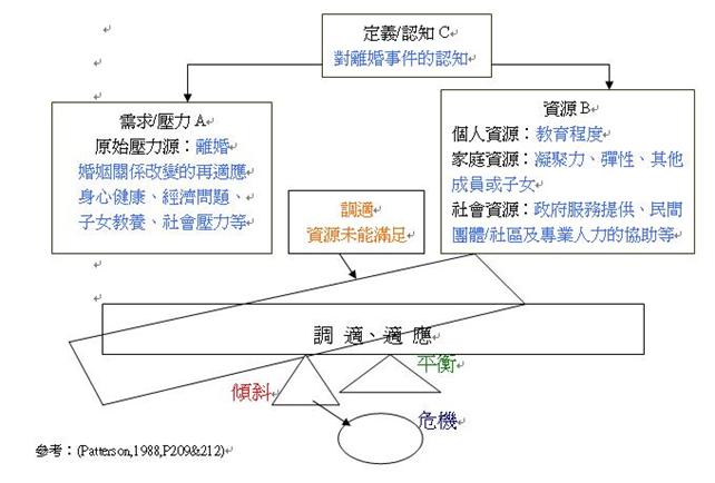 (三)『C』:家庭對事件的認知或定義;意指離婚者自身對壓力的主觀認知,當離婚者認為離婚之壓力並非對其有太大的影響時,便不足以構成傷害,而影響離婚者的生活適應。