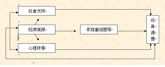 由Ihinger-Tallman(1986)綜合有關文獻所提出的,此理論之變項有四個:家長資源(指家長的教育程度及收入)、家庭成員的心理特質(指價值與態度)、社會支持(指社區、教育或治療機構)和家庭重組歷程(指親子關係、監護抉擇、家庭次級系統界線等)四項,此四項因素之間是交互的、多元的,茲以下圖來說明:(歐貴英,1996)