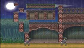 在<<神影無蹤–廖添丁>>網路遊戲創作的論文裡[10],提到將每一張地圖由許多小平台組成, 而非一張張大型圖檔(圖4)。使得圖形檔案可以重複被利用,而不致於使玩家下載太多時間,且能夠提升系統遊戲執行時的效能。基於此系統架構,每次場景捲動時,都將會有數十個至數百個圖片須處理移動動作,如不作前置處理則系統效能將嚴重不足。因此在場景移動前,會先做一次位置判斷,將螢幕可視範圍外的圖片暫時移除,只顯示並處理螢幕範圍中的所有圖片,以提升系統效能。