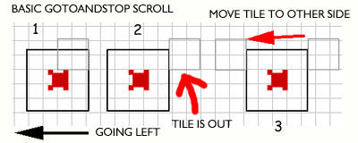 而國外的遊戲教學文章,提供了一種叫做“gotoAndStop”的捲軸製作方式[11],其原理是遊戲地圖由許多大小相同的方塊所組成。執行時只把可見部分的方塊放在螢幕上,當它們移出可見區域時,將相同的方塊移動到另一端,重新命名,並且再次使用相同的MovieClip。