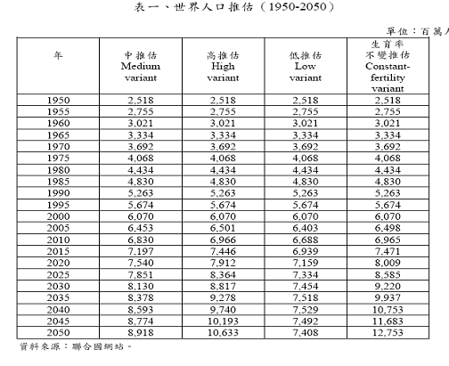 表三:全球及世界各大洲人口數(內政部網站,2005)