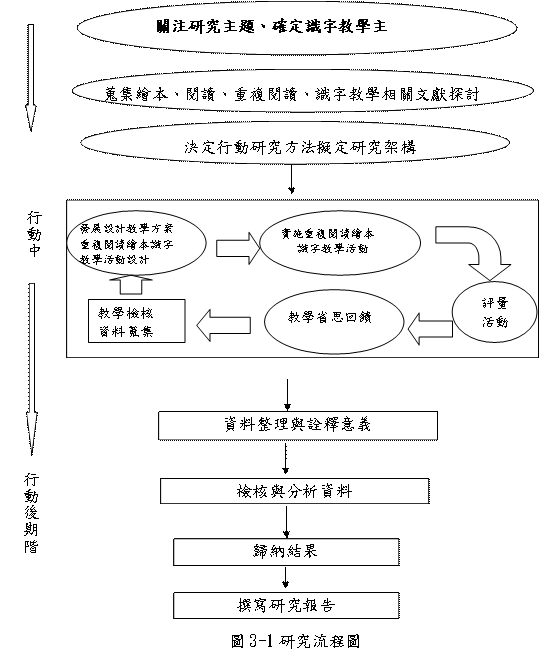 本研究內容而言,本研究主要探討大班幼兒以「重複閱讀繪本識字教學活動」,幼兒在學習歷程中表現、中文識字能力發展;幼稚園教師的教學循環歷程的反思、檢討、修正教學策略與以整理分析撰寫研究報告。