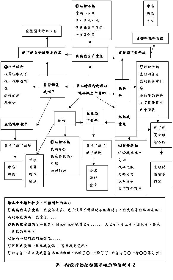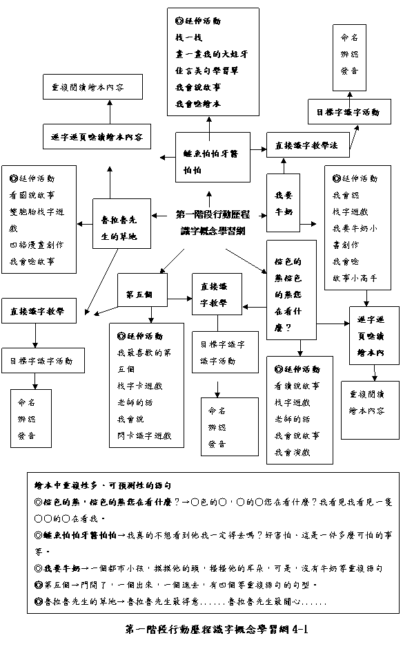 recognition)及字義搜尋(semantic encoding)(perffetti,1984,引自柯華崴,1993)。讀者必須訓練文字解碼(letter decoding)的策略,讓解碼過程成為自動化,當閱讀者花較少時間與精力於文字符號的解碼活動,就有較多的工作記憶與心理能量進行高階的閱讀理解。因此,以重複閱讀繪本融入識字教學就更刻不容緩的工作。